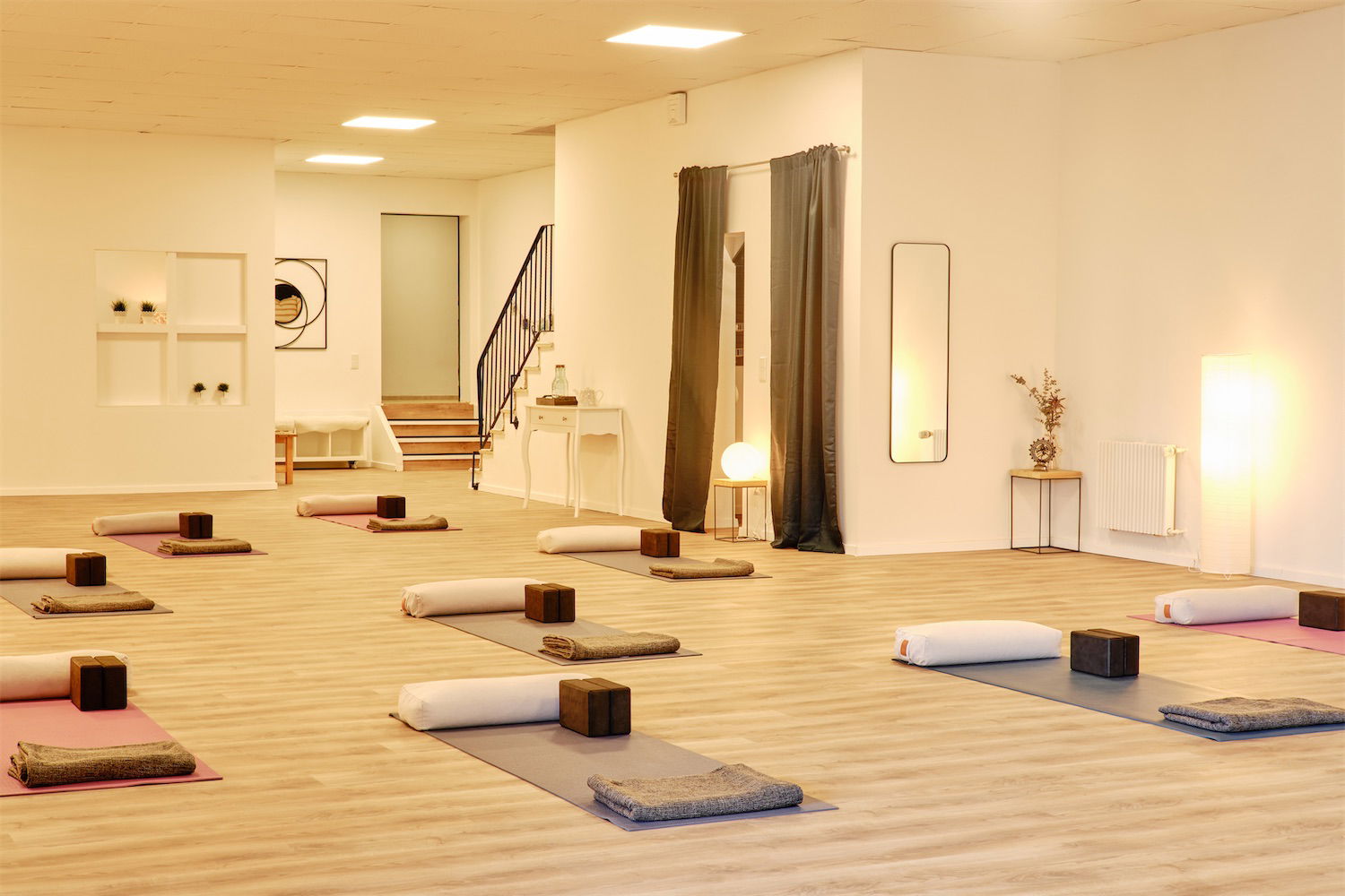 Neben dem großzügigen Bewegungsbereich findest du noch: einen charmanten Massageraum, eine süße Teeküche, zwei Umkleidekabinen, zwei Toiletten mit Fenster, Abstellmöglichkeiten für eigene Utensilien und mehrere Sitzoasen.